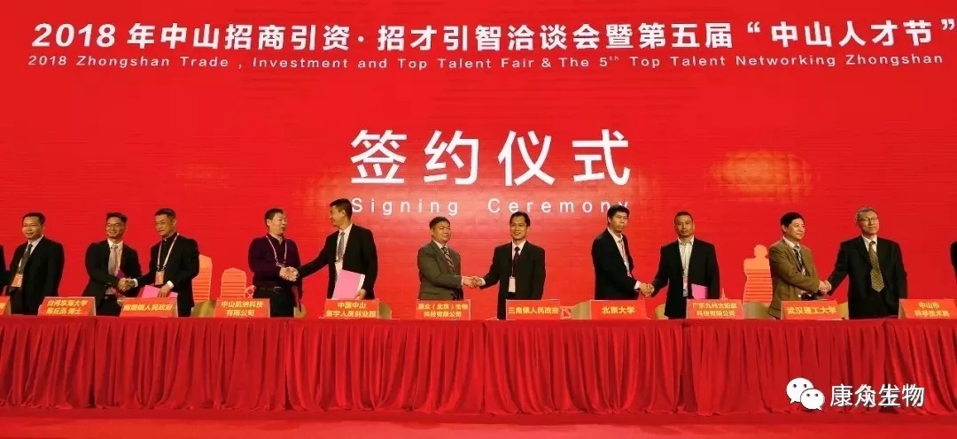 今天上午,2018年中山招商引資·招才引智洽談會(huì )暨第五屆中山人才節開(kāi)幕式,在中山博覽中心綜合展廳主會(huì )場(chǎng)舉行。三角鎮黨委書(shū)記黃澤科代表三角鎮人民政府與康眾(北京)生物科技有限公司進(jìn)行簽約。